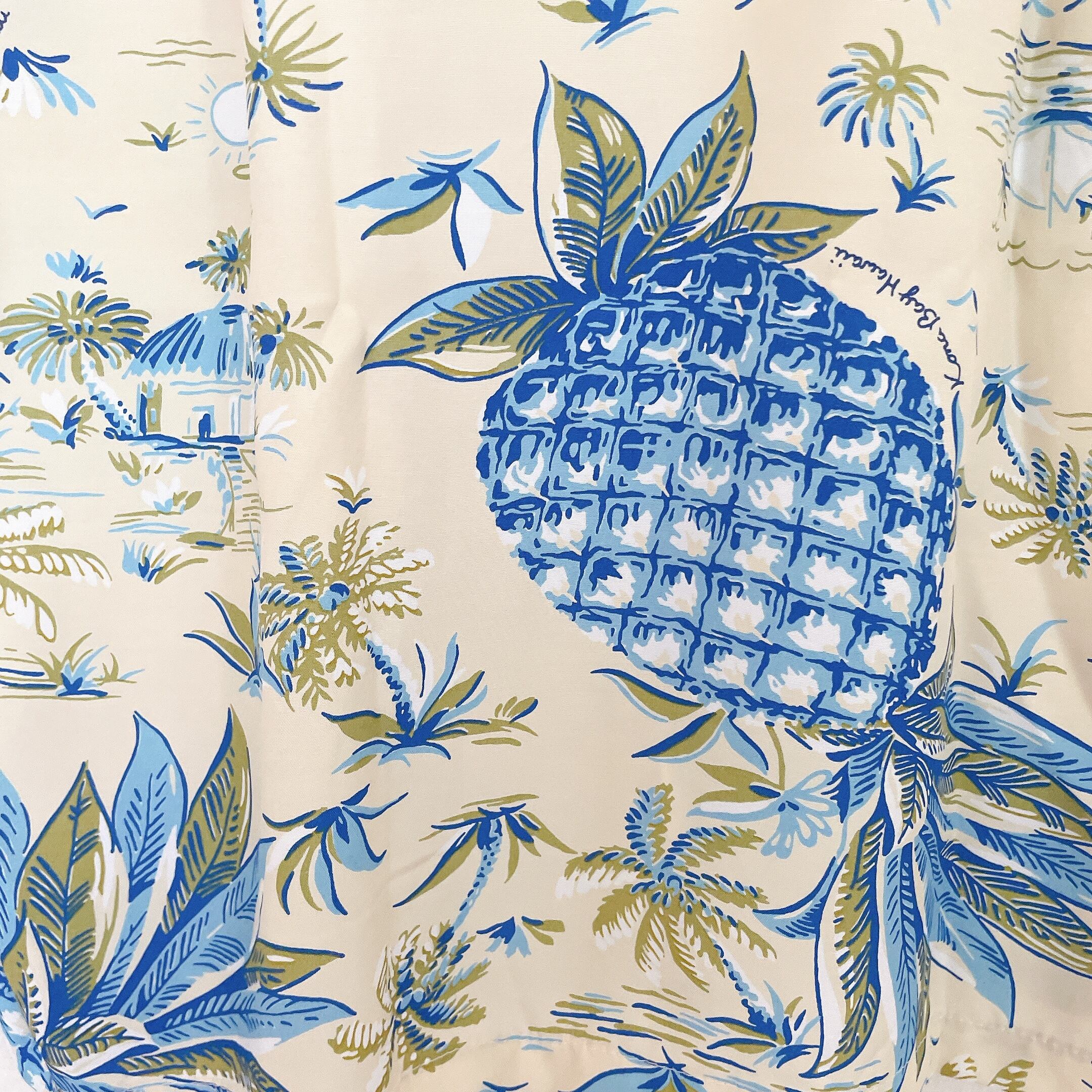 アイボリーのベースに爽やかな水色のパイナップルが映え、ヴィンテージらしい存在感を放ちます。リジッドデニムや黒のパンツと合わせれば、上品さとリゾート感を兼ね備えたスタイルに。
