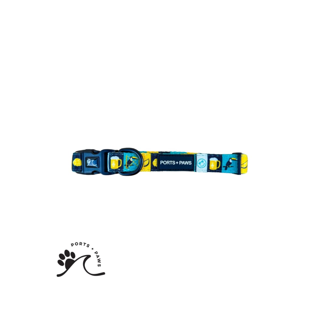 PORTS + PAWS × ALOHA BEER のスペシャルコラボプリントのCOLLAR。快適さを追求したネオプレン素材を使用。首回りはサイズ調整が可能で、リードを取り付けられるDリングが1つ付いています。同シリーズのリード、うんちバッグホルダー、バンダナとお揃いでコーディネートできます。