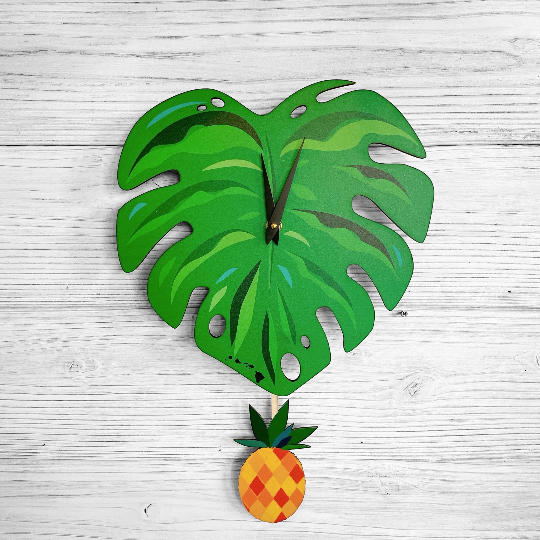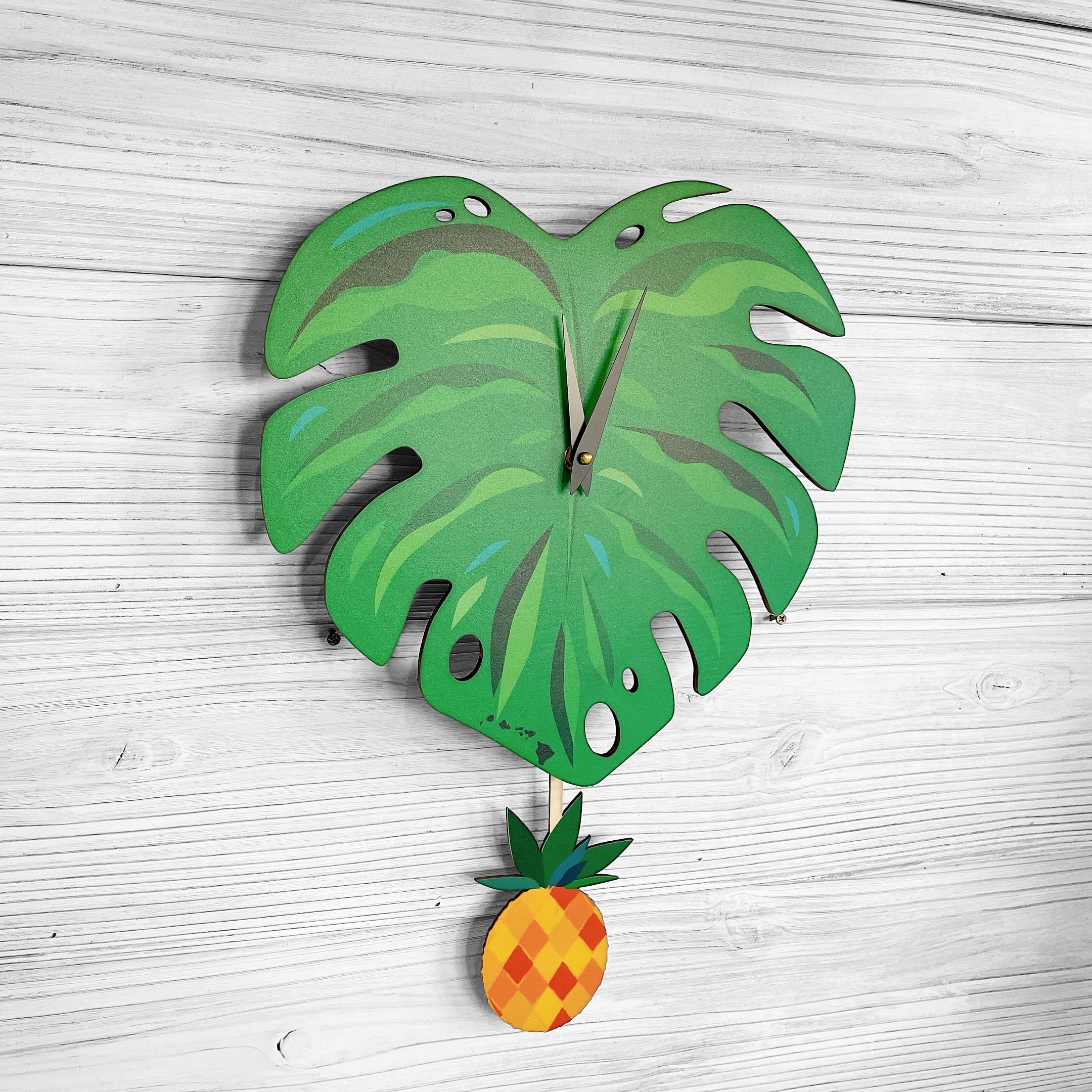 モンステラ パイナップル振り子時計で、お部屋を南国の楽園へ。大胆なボタニカルデザインと、ゆらゆら揺れるパイナップルの振り子が、まるでパラダイスにいるかのような気分へと誘ってくれるユニークな時計です。お部屋をトロピカルに彩るインテリアとしても、大切な人への贈り物としてもおすすめです。この時計とともに、日常に“ALOHA”を感じてみませんか?