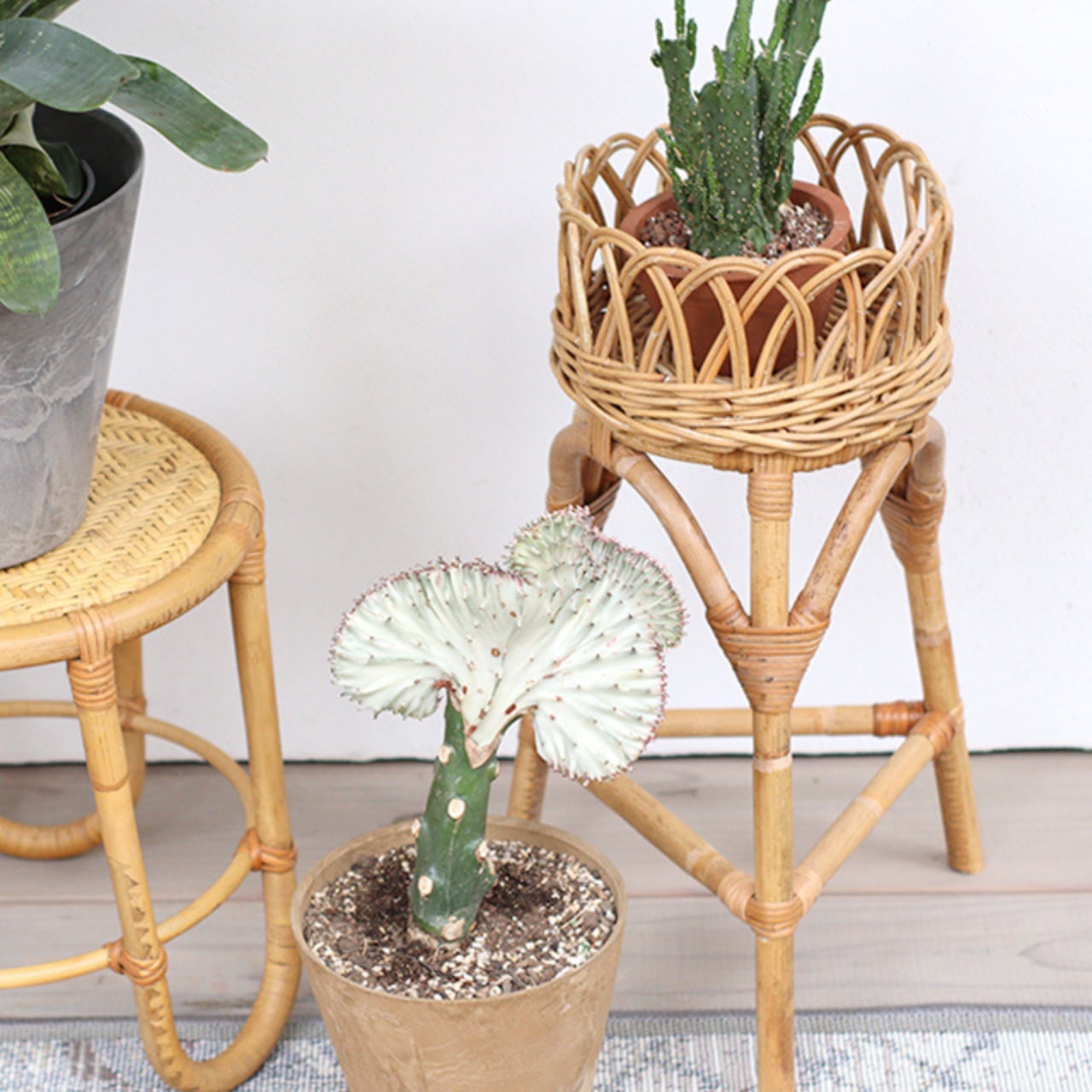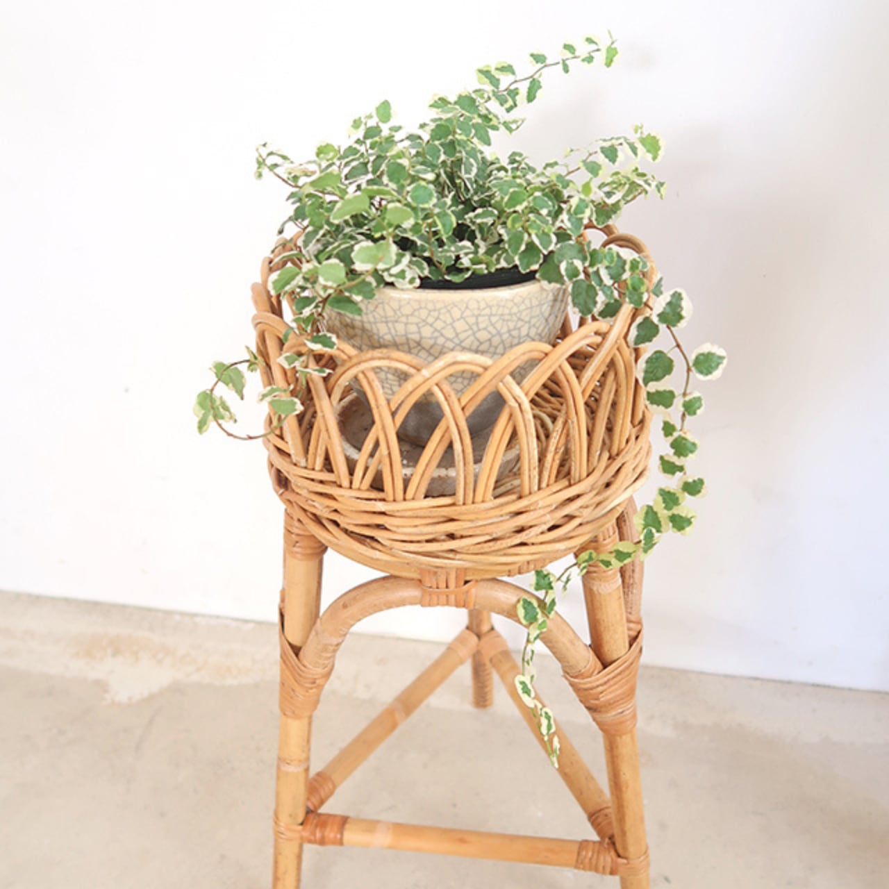 手の込んだデザインで、植物を置いてディスプレイするだけで絵になる空間を演出してくれます。丁寧に編み込まれたラタンのデザインが、ヴィンテージらしい温かみのある雰囲気を感じさせます。使い込むほどに色艶が増し、美しい飴色へと変化していくのも魅力です。