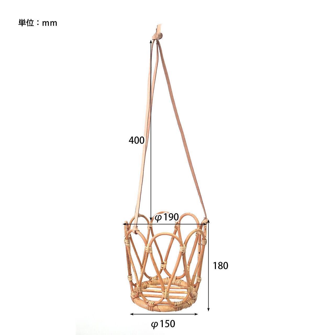 直径15cm(5号鉢サイズ)までの鉢に対応しています。素材には皮付きラタンを使用し、すべて手作業で丁寧に作られています。中が見えるデザインのため、入れる鉢の色や模様によって印象が大きく変わり、コーディネートを楽しめます。ハンギング部分には本革のレザー紐を使用。ラタンと革はどちらも使い込むほどに色味が深まり、経年変化も魅力のひとつです。