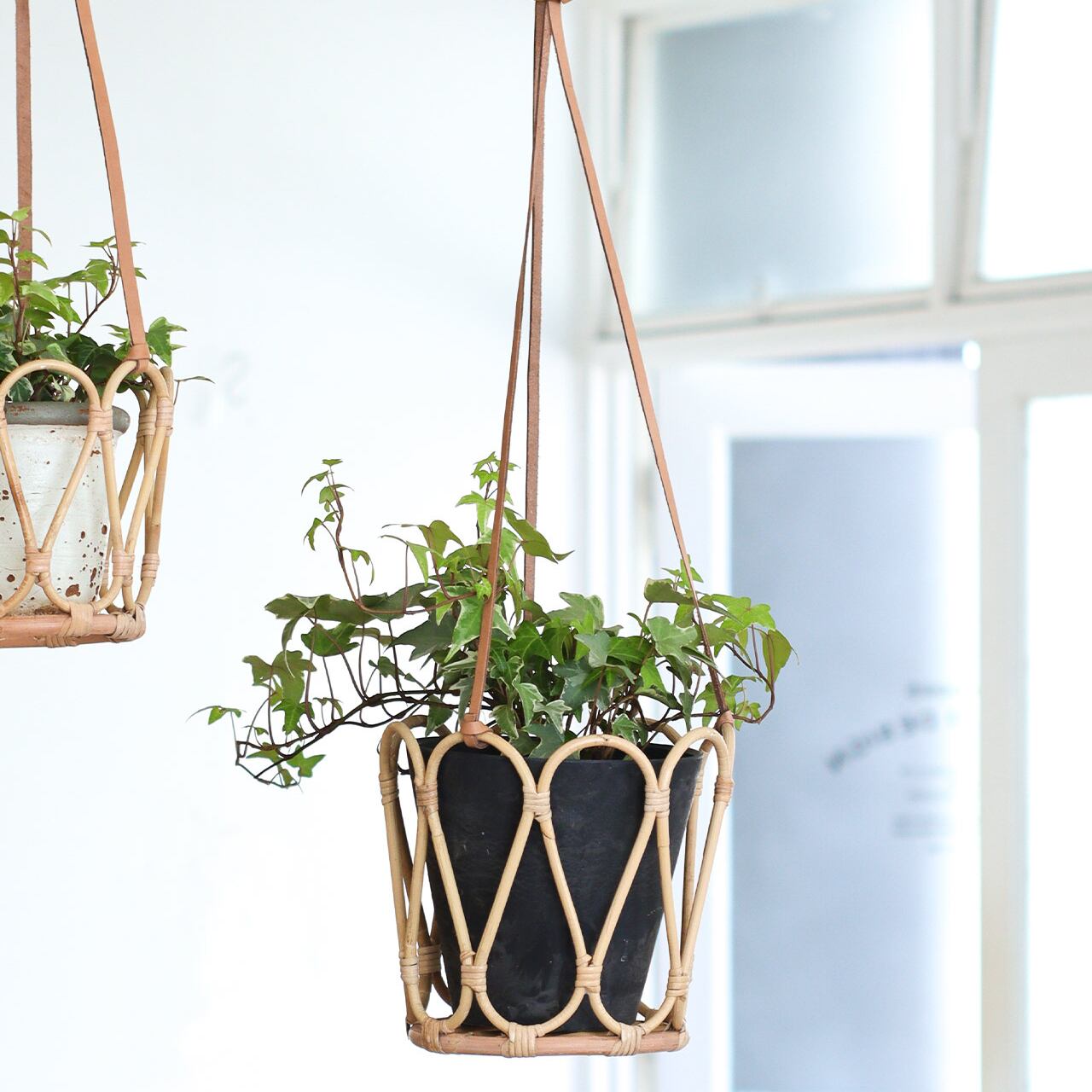 ラタンのやわらかな曲線と、本革のレザー紐が美しく調和したデザインのハンギングポット。