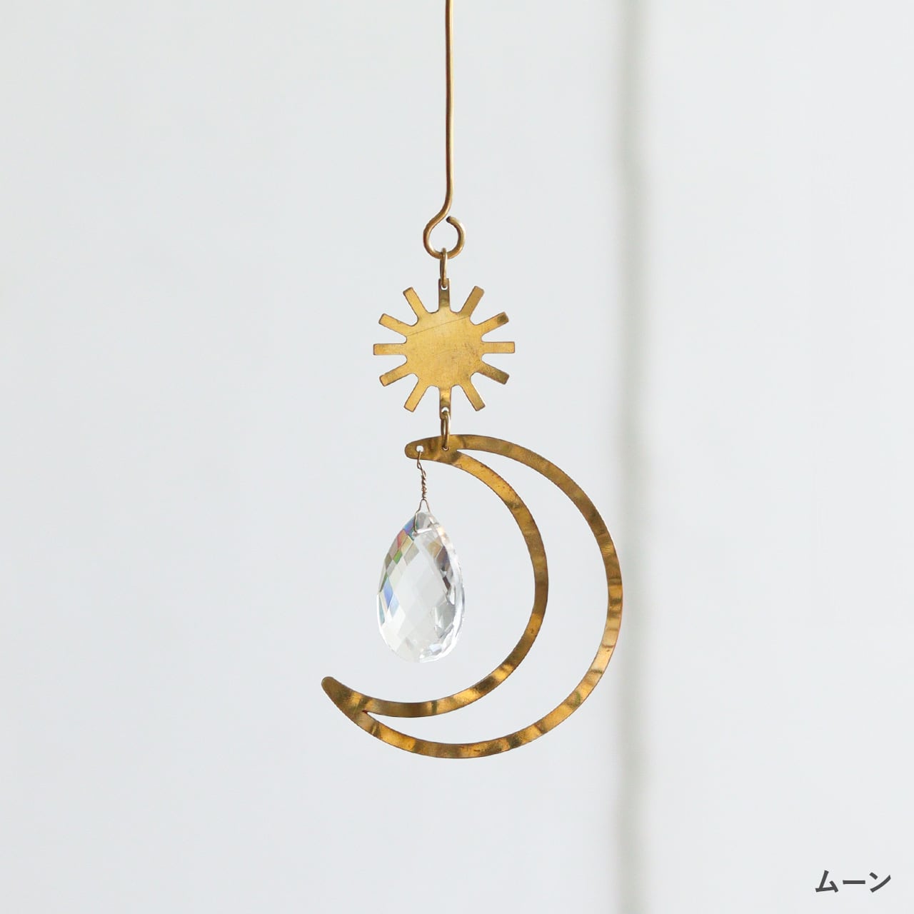 味わい深い真鍮で作られた月や太陽のモチーフに、ガラスパーツを組み合わせたシンプルで洗練されたデザインのオーナメント。多面カットされたガラスに太陽の光が当たると、室内にきらきらと細かな光を反射し、お部屋を幻想的な空間に演出してくれます。先端はフック仕様になっているため、カーテンレールやS字フックに掛けるだけで気軽に飾ることができます。