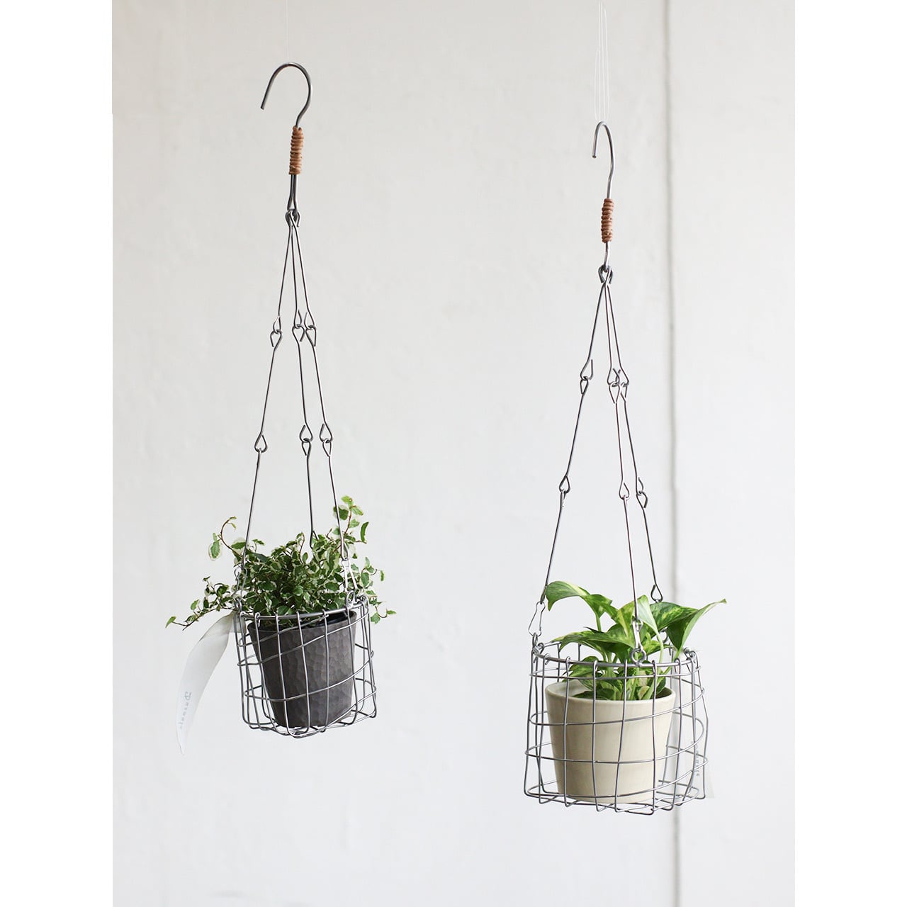 ワイヤーを使ってハンドメイドで編み上げたハンギングポットカバー。落ち着いたシルバー塗装で仕上げ、アクセントに柳を取り入れたデザインです。お気に入りの鉢をそのまま入れてフックなどに吊るすだけで、手軽にハンギンググリーンをお楽しみいただけます。ナチュラルになりすぎない上品なシルバーカラーは、お部屋のインテリアのアクセントにもぴったり。