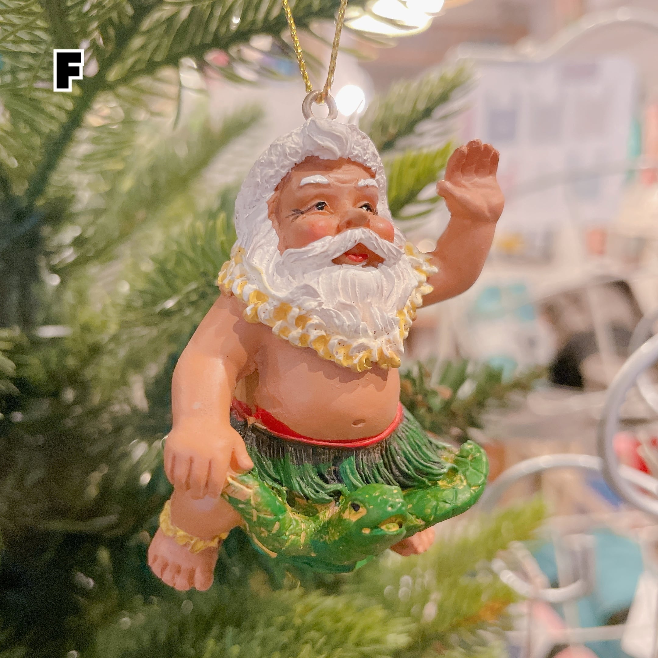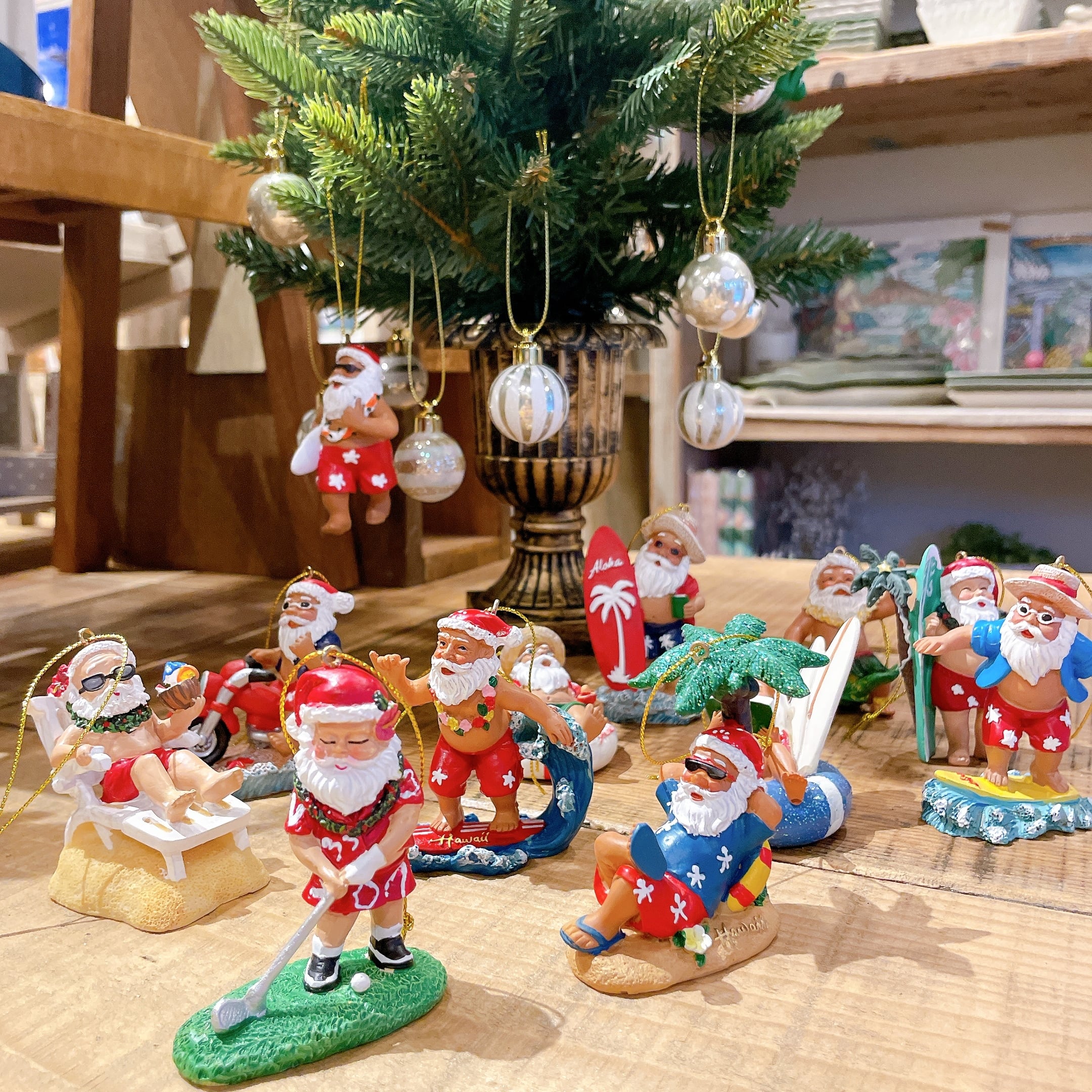 HAWAIIから届いたクリスマスオーナメントは、フラダンスを踊ったり、サーフィンをしていたり、とても楽しそうな南国のサンタクロース。 1つ1つハンドペイントされた可愛いオーナメントです。クリスマスツリーを更に華やかにしていること間違いなし!mele kalikimaka(メレ カリキマカ)は、ハワイ語でメリークリスマス。